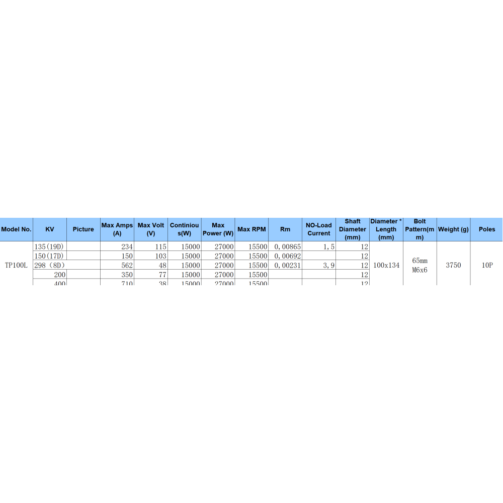 TP Power motors are made of the best materials that are available, and have high efficiencies (>90%) required for the most demanding applications. TP100 series is made for the extreme power applications. It features a 10-pole design and has a lot of torgue, with 15500 max RPM, it can output up to 27000 Watts. Please refer to the popup chart for detailed parameters. Besides the KV listed in the chart, we are able to custom made TP 100 motors within 70KV to 800KV. Please email to info@tppower-europe.com for special KV or other questions.
