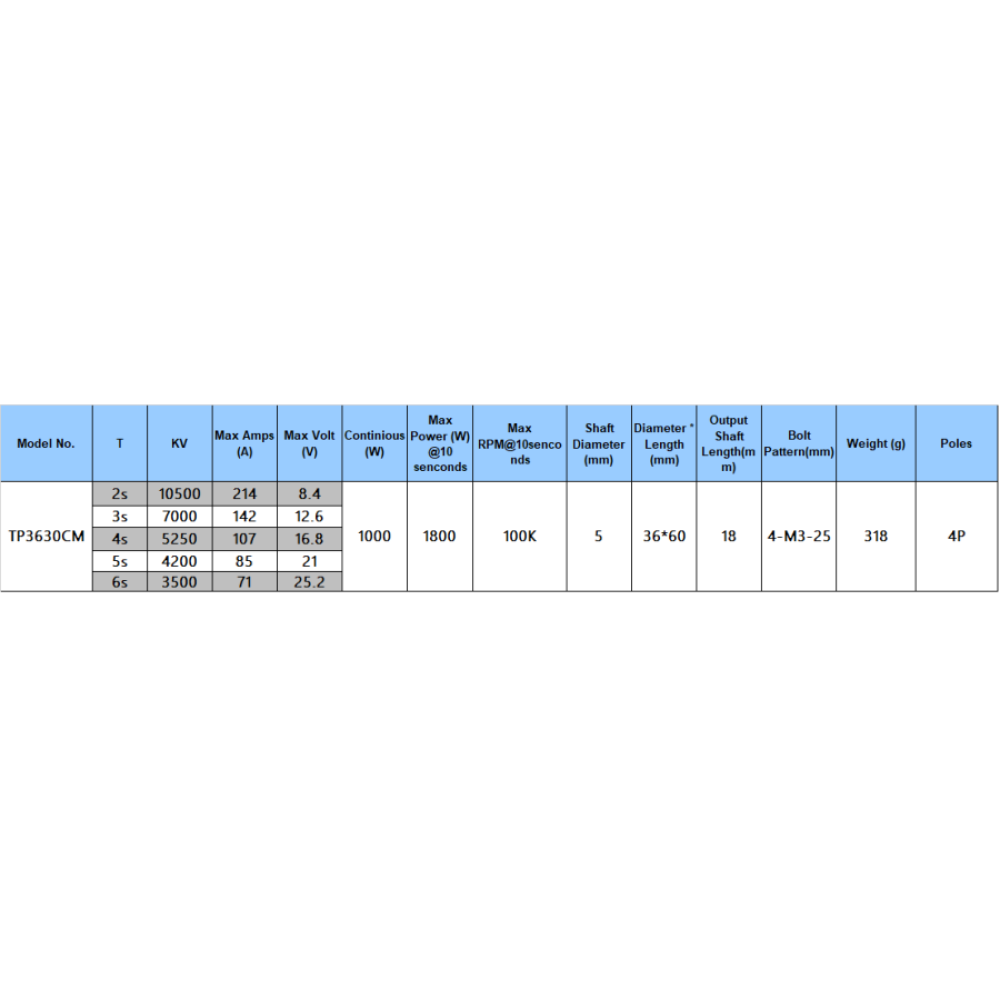 The TP 3630-CM series is our popular series for high speed application, for example, speed run and drag racing, with the maximum burst RPM of 100k! These motors are built on order and has a lead time of 4-6 weeks. Please see the data on the pop-up chart for full details. If you need special KV not listed on the chart, please contact us through info@tppower-europe.com for evaluation. We are able to make a wide range of KV's.