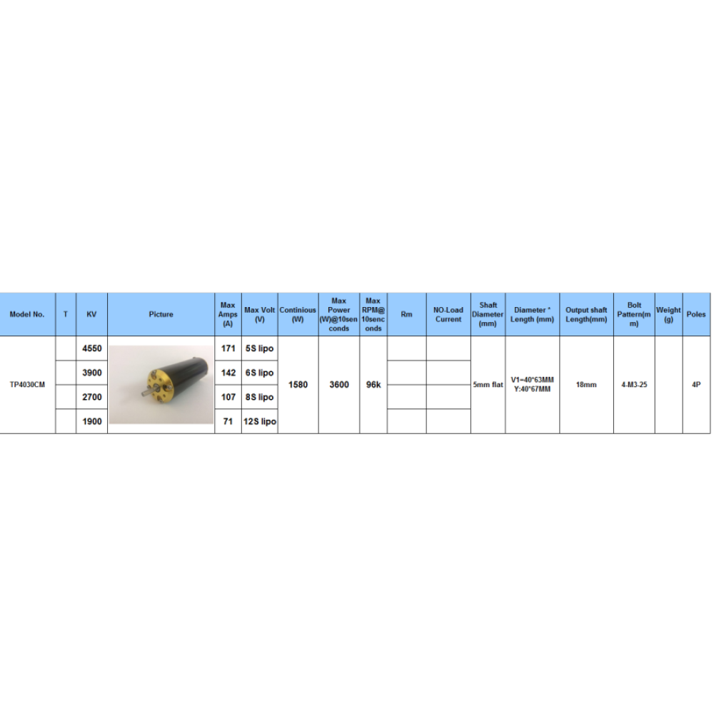 The TP 4030-CM series is our popular series for high speed application, for example, speed run and drag racing, with the maximum burst RPM of 96k! These motors are built on order and has a lead time of 3-4 weeks. Please see the data on the pop-up chart for full details. If you need special KV not listed on the chart, please contact us through info@tppower-europe.com for evaluation. We are able to make a wide range of KV's.