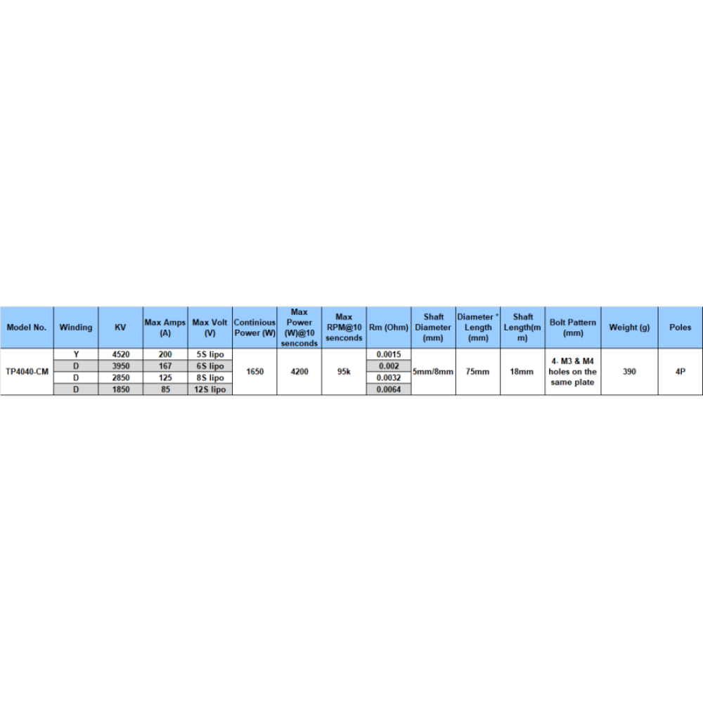 The TP 4040-CM series is our popular series for high speed application, for example, speed run and drag racing, with the maximum burst RPM of 95k! These motors are built on order and has a lead time of 3-4 weeks. Please see the data on the pop-up chart for full details. If you need special KV not listed on the chart, please contact us through info@tppower-europe.com for evaluation. We are able to make a wide range of KV's.