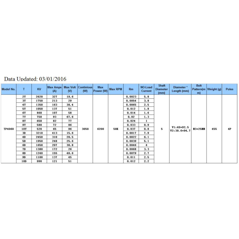 TP Power motors are made of the best materials that are available, and have high efficiencies required for the most demanding applications. The TP 4060 Series can be applied in Fun jets, F5B, Trex 600, Mono, Hydro, CAT, etc. Please refer to the popup chart for available models and detailed parameters. All of the motors are made on order, and the delivery time is about 4-6 weeks.