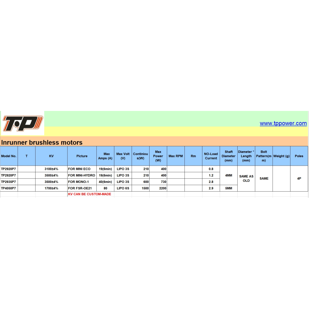 These motors are built on order and has a lead time of ~4-6 weeks. Please see our spec sheet images for full details. If you need special KV not listed on the chart, please contact us through info@tppower-europe.com for evaluation. We are able to make a wide range of KV's.