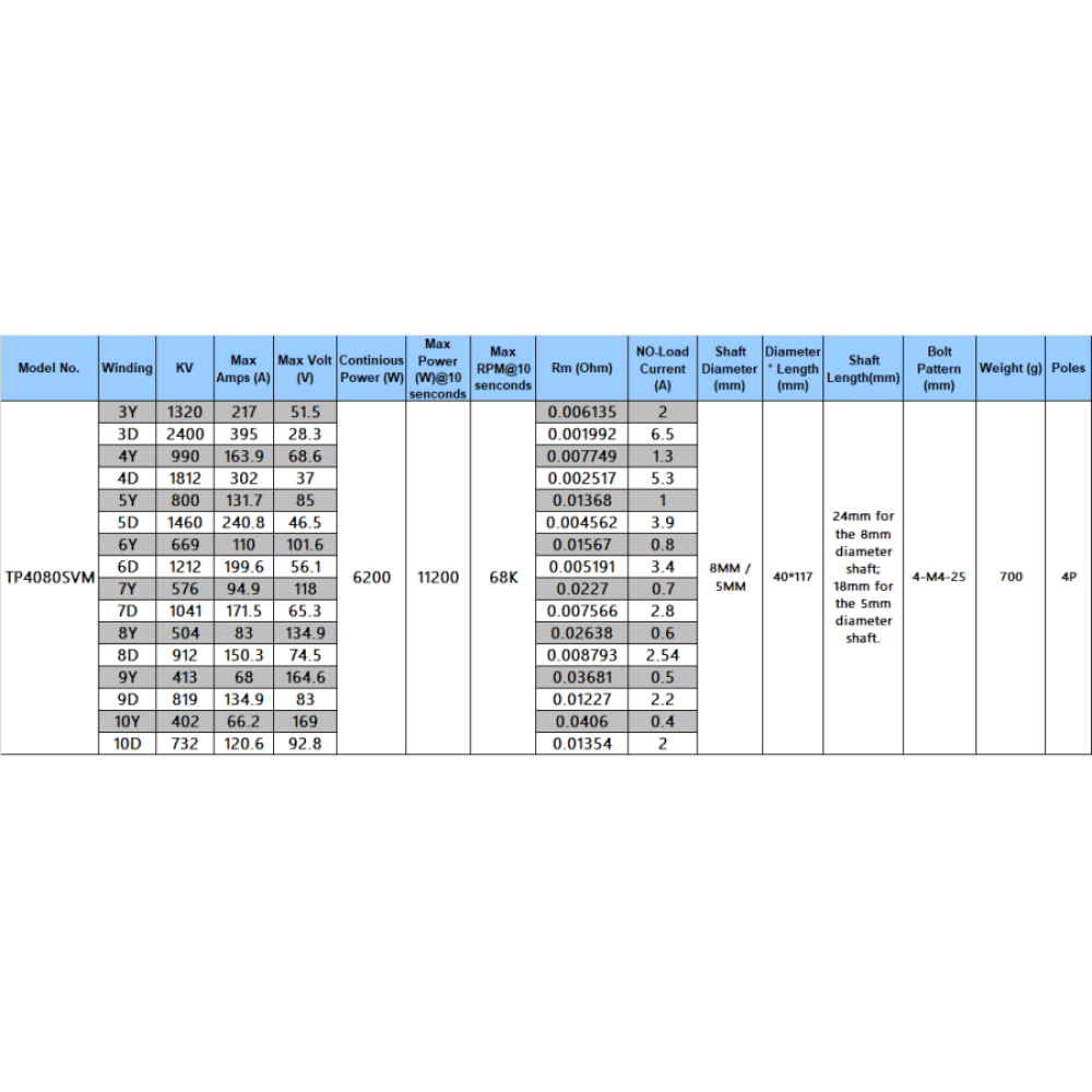 TP4080-SVM Series are the new competition 4-pole motor with more torque and power under high RPM design. The motors in the "build your own" catogory are made on order. Customers have flexible choice of building the motors according to your specific need. The ship time is about 4-6 weeks after the order is placed. Please plan ahead if you need to custom-build a motor.