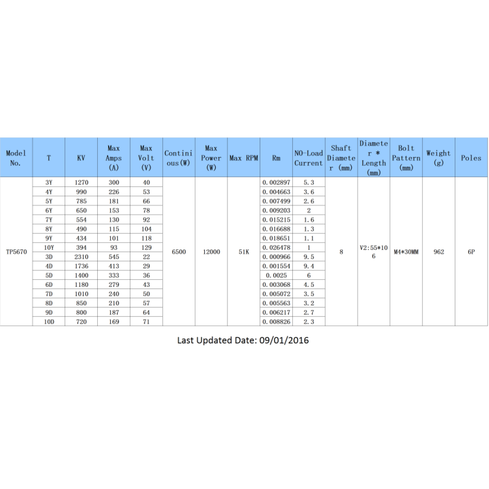 We are proud to release our new upgraded TP5670 motors in December 2015, which has max power of 12000W and max RPM of 51K. TP Power motors are made of the best materials that are available, and have high efficiencies (>90%) required for the most demanding applications. The TP 5670 Series can be applied in Fun jets, Mono, Hydro, CAT, cars, etc. Please refer to the popup chart for available models and detailed parameters.