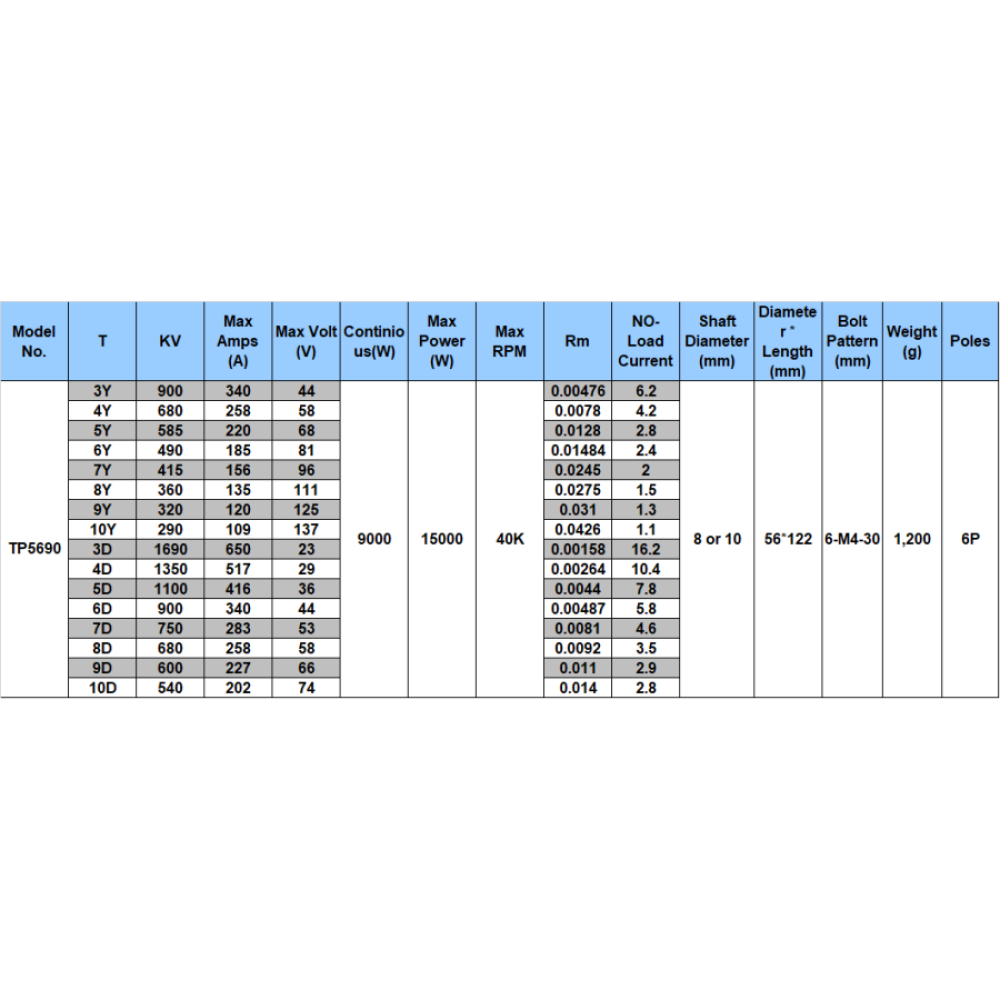 TP Power motors are made of the best materials that are available, and have high efficiencies (>90%) required for the most demanding applications. The TP 5690 Series can be applied broadly in robotics, RC boat, car and airplaines. Please refer to the popup chart for available models and detailed parameters.