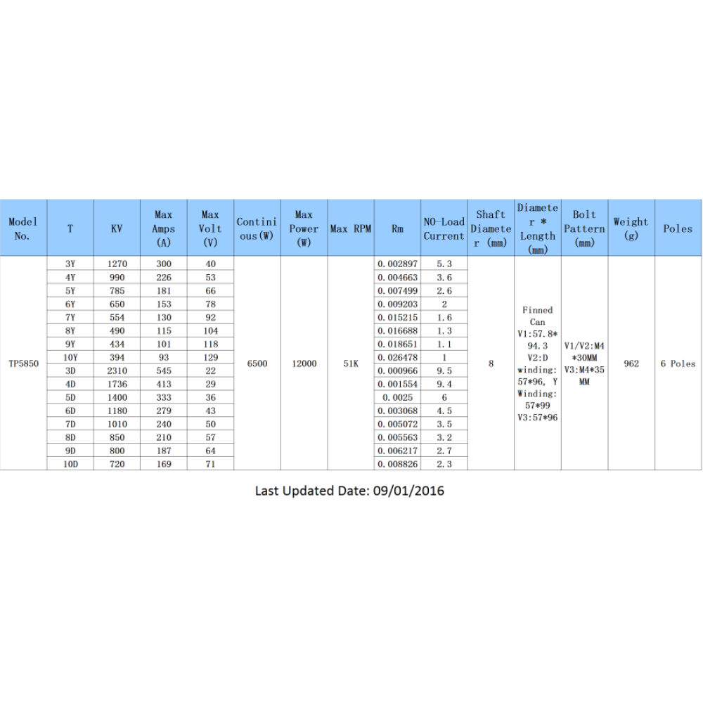 We are proud to release our new upgraded TP5850 motors in December 2015, which has max power of 12000W and max RPM of 51K. There are three different can selections that can meet different requriements of you application. TP Power motors are made of the best materials that are available, and have high efficiencies required for the most demanding applications. The TP 5850 Series can be applied in 120 mm EDF, Fun jets, Mono, Hydro, 1/5 Car, etc. Please refer to the popup chart for available models and detailed parameters.